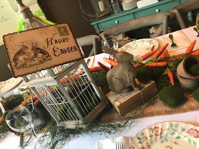 This is what I came up with for this year. I like to “shop” around my house and pull a theme together. This year it was bunnies in the carrot patch.