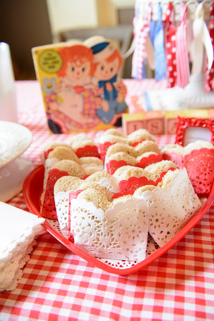 Some of my favorite and most cherished memories of my childhood birthdays are of the fun games and activities that my mom would come up with. Our friends always loved coming to our parties because of them! So, I wanted to come up with some fun activities that would go along with our Raggedy Ann theme and the story of how she got her candy heart. I made a washing and stuffing “station”. We had Raggedy Ann candy hearts (valentine hearts), Raggedy Ann hair (red shoe string licorice ), and Raggedy Ann stuffing (cotton candy). Guests were encouraged to take a big scoop of each and fill clear party bags.