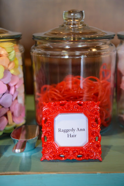 Some of my favorite and most cherished memories of my childhood birthdays are of the fun games and activities that my mom would come up with. Our friends always loved coming to our parties because of them! So, I wanted to come up with some fun activities that would go along with our Raggedy Ann theme and the story of how she got her candy heart. I made a washing and stuffing “station”. We had Raggedy Ann candy hearts (valentine hearts), Raggedy Ann hair (red shoe string licorice ), and Raggedy Ann stuffing (cotton candy). Guests were encouraged to take a big scoop of each and fill clear party bags.