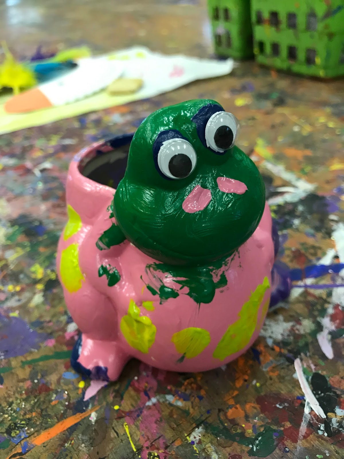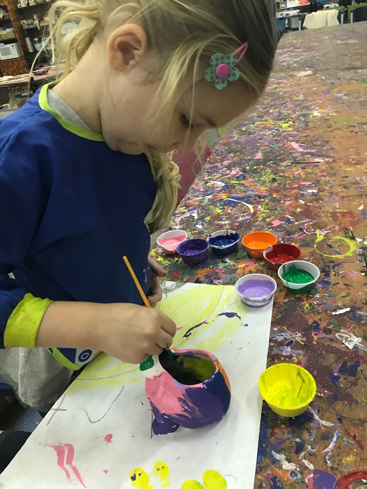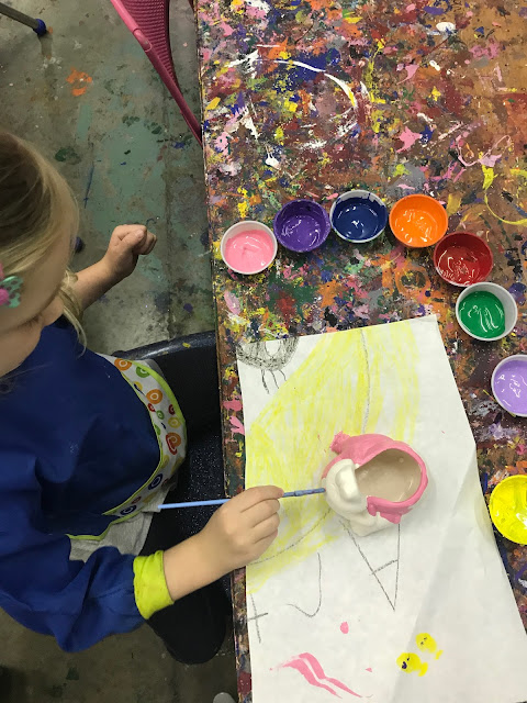 Our next project was a Make and Take piece that we could paint and take home the same day. Miss 4 selected a cute little frog that daddy could fill with pencils and pens at work. She did a great job and only dipped her long blonde pony tail once in the purple paint!