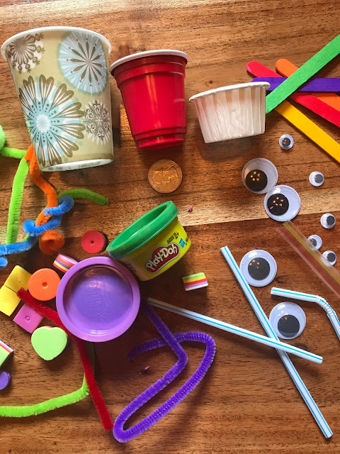 Create-A-Monster could not be easier! All you need is a ziplock bag and craft supplies from around the house. We already had the following items that were purchased at the Dollar Store- colored popsicle sticks, straws, buttons, pompoms, eye balls (a must), beads, feathers, foam beads, pipe cleaners, mini solo cups, and tasting cups. Don’t forget the Play-Doh! We used the mini ones so we can keep everything in one bag.