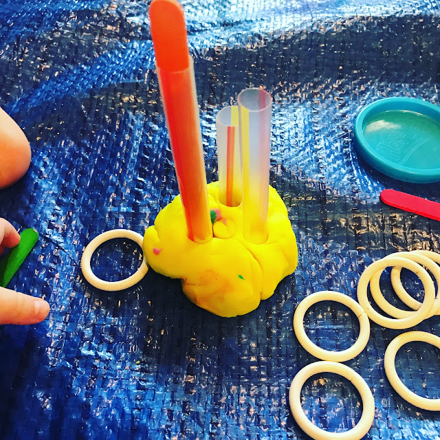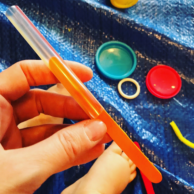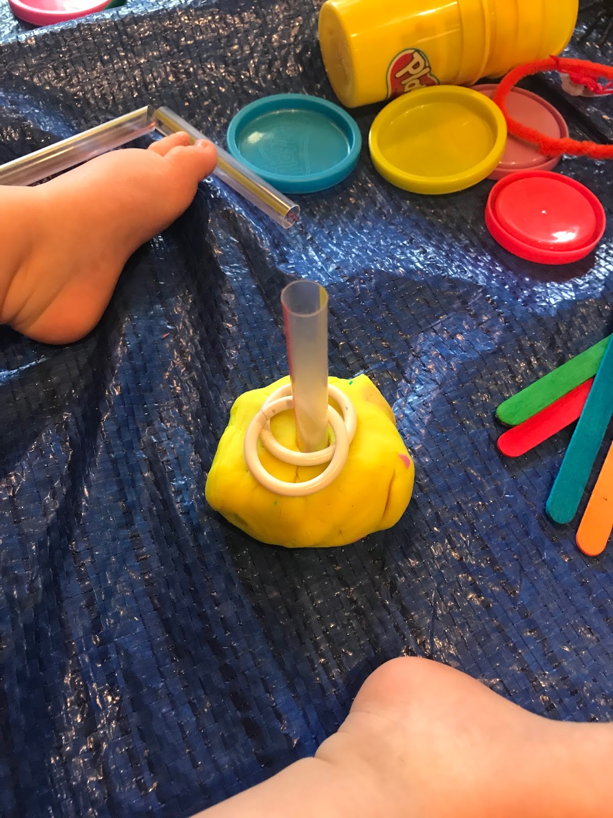 Baby actually came up with this idea on her own. She stuck the colored popsicle sticks into the large boba straws. We loved watching her concentration and how proud she was of herself.