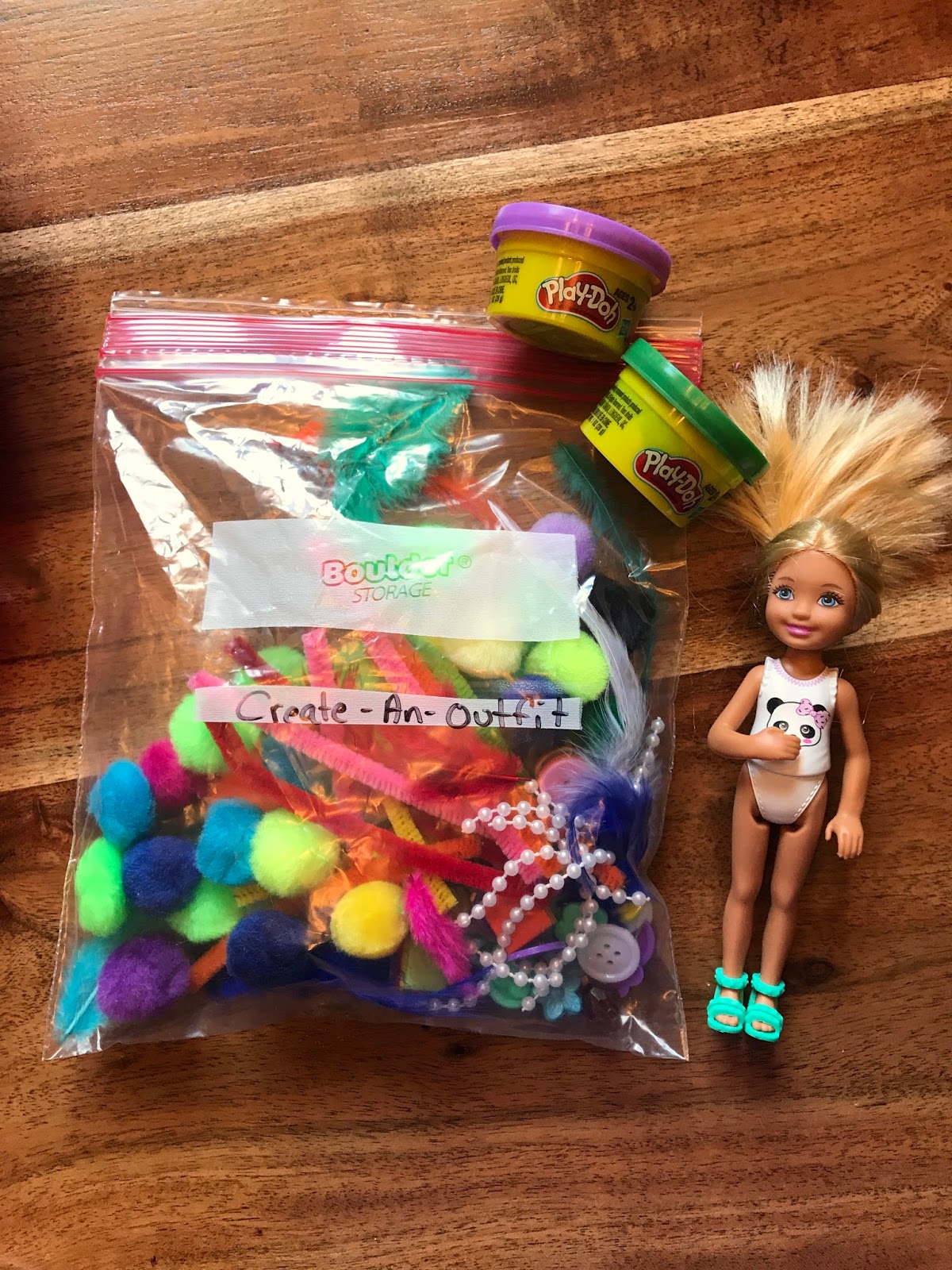 I think this activity is the one our 4 year old is most looking forward to. I let her try it out on the day I was gathering all the tidbits for it. She wound up playing with it for over an hour. I told her I was putting it up until the trip so it would be new and exciting. 4 year old sad face.