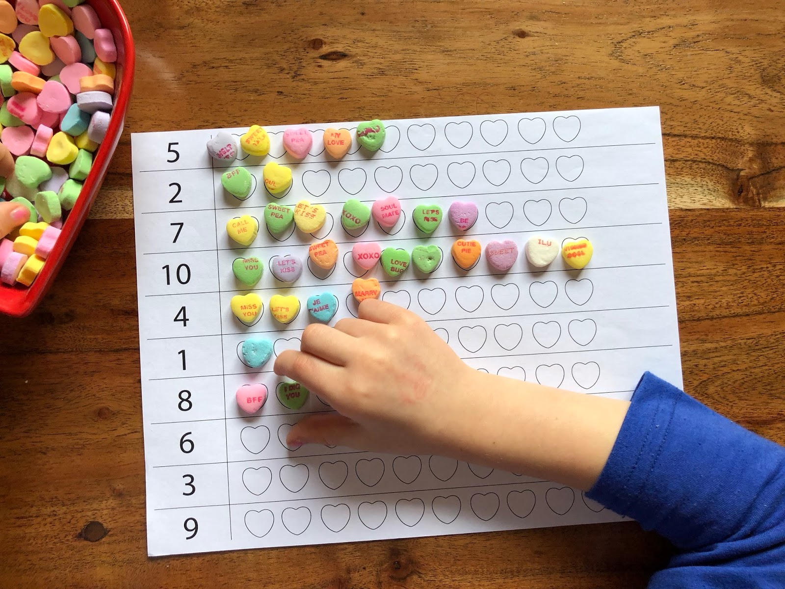 We found this graph online years ago and laminated it for multiple usage.  There are many blank graphs available online or you can simply draw one. Give your sweetie pie a handful of convo hearts and have them graph out the colors.  Then, ask questions about their completed graph.  Which color has the most? Which color has the least?  What is yellow plus blue?