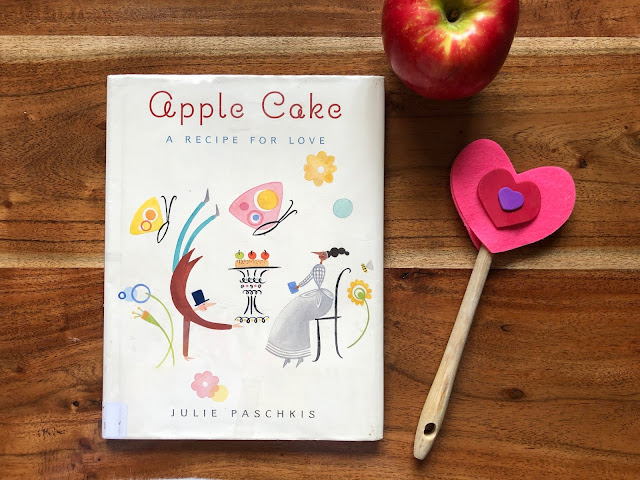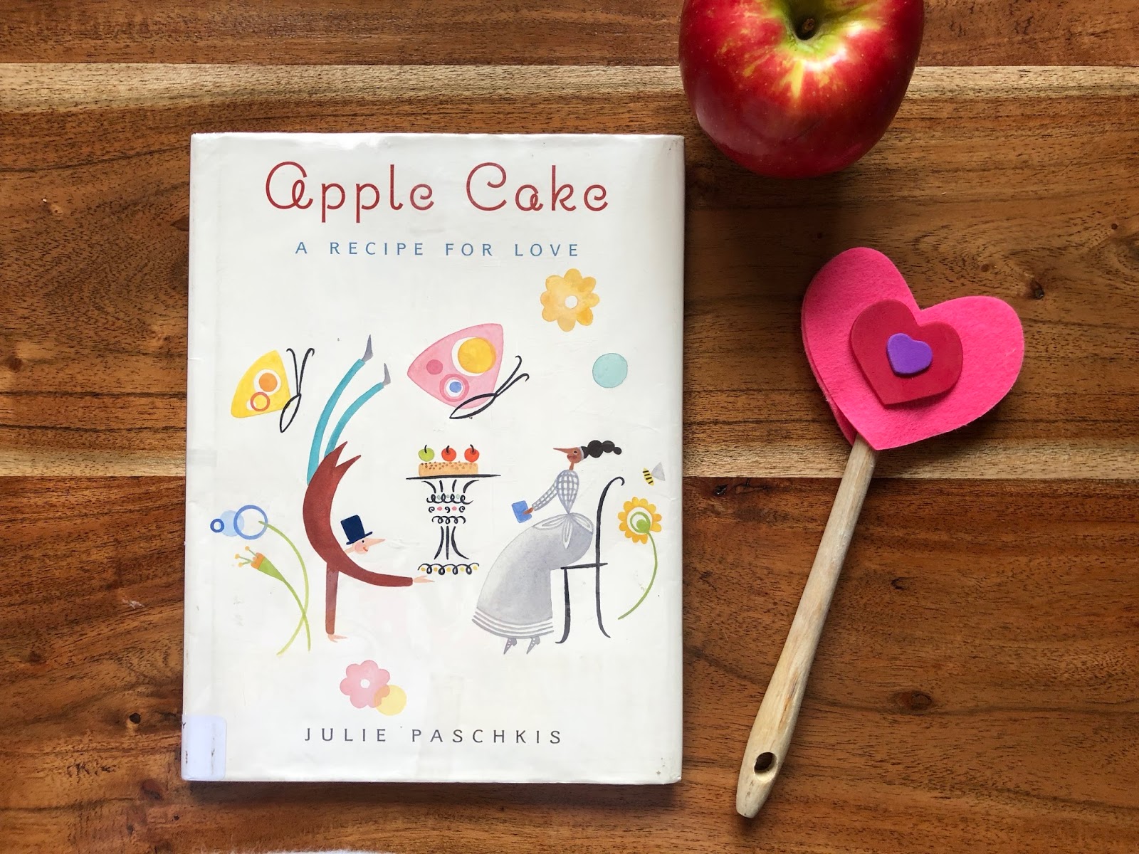Apple Cake A Recipe for Love by Julie Paschkis is a simple and whimsical story of a boy trying to get the attention of a book loving girl. The only way he can get her nose out of her book is by making her an apple cake. Paschkis uses her great grandmother’s apple cake recipe and turns it into a beautiful love story. It’s like a love story within a love story! Apple Cake reads just like a recipe, with Alfonso, our hero, finding ingredients in the loveliest of places- salt from the sea, eggs from a nest, butter from the sun….