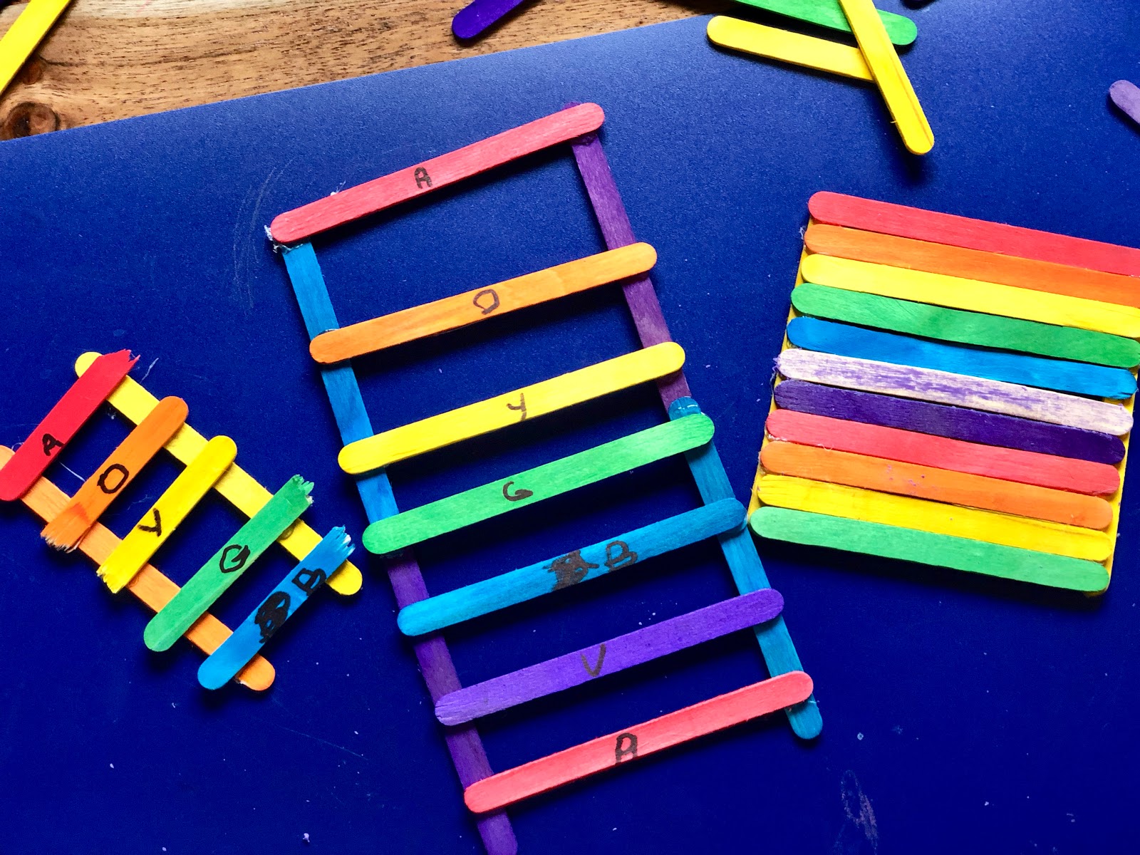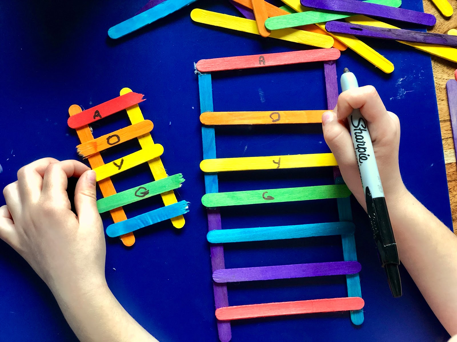 She then decided to use our fun rainbow colored craft sticks from Dollar Tree to build some inclined planes for our leprechaun traps. While making them, we discussed the colors of the rainbow and Miss 4 decided she would “label” each ladder rung with the first letter of the color.