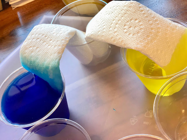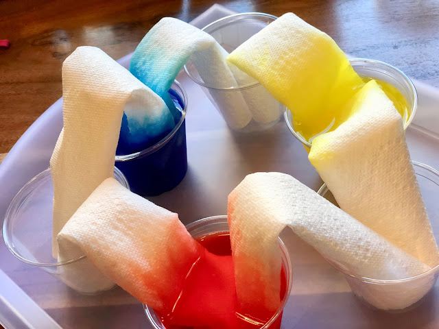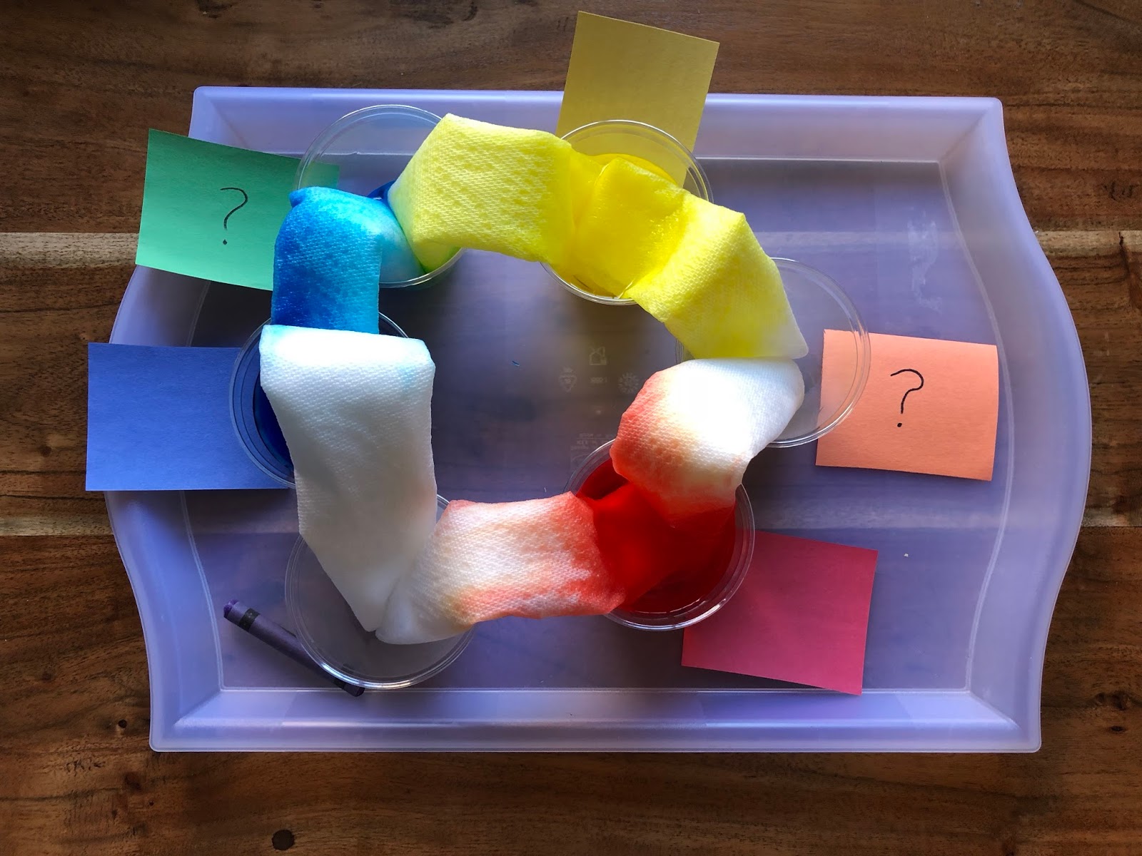 Step 3: Wait for your rainbow to start “walking”. This could take up to 2 days. In the meantime, make a hypothesis or prediction as to what you think will happen. Discuss primary colors (red, blue and yellow) and how they are used to make secondary colors (green and purple).