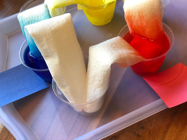 Step 1: Fill 3 cups with water and place 2-3 drops of red food coloring in one, blue in another, and yellow in the last. Leave 3 cups empty. Arrange cups in a circle on a tray, alternating filled cup, empty cup, filled cup, empty cup. . .