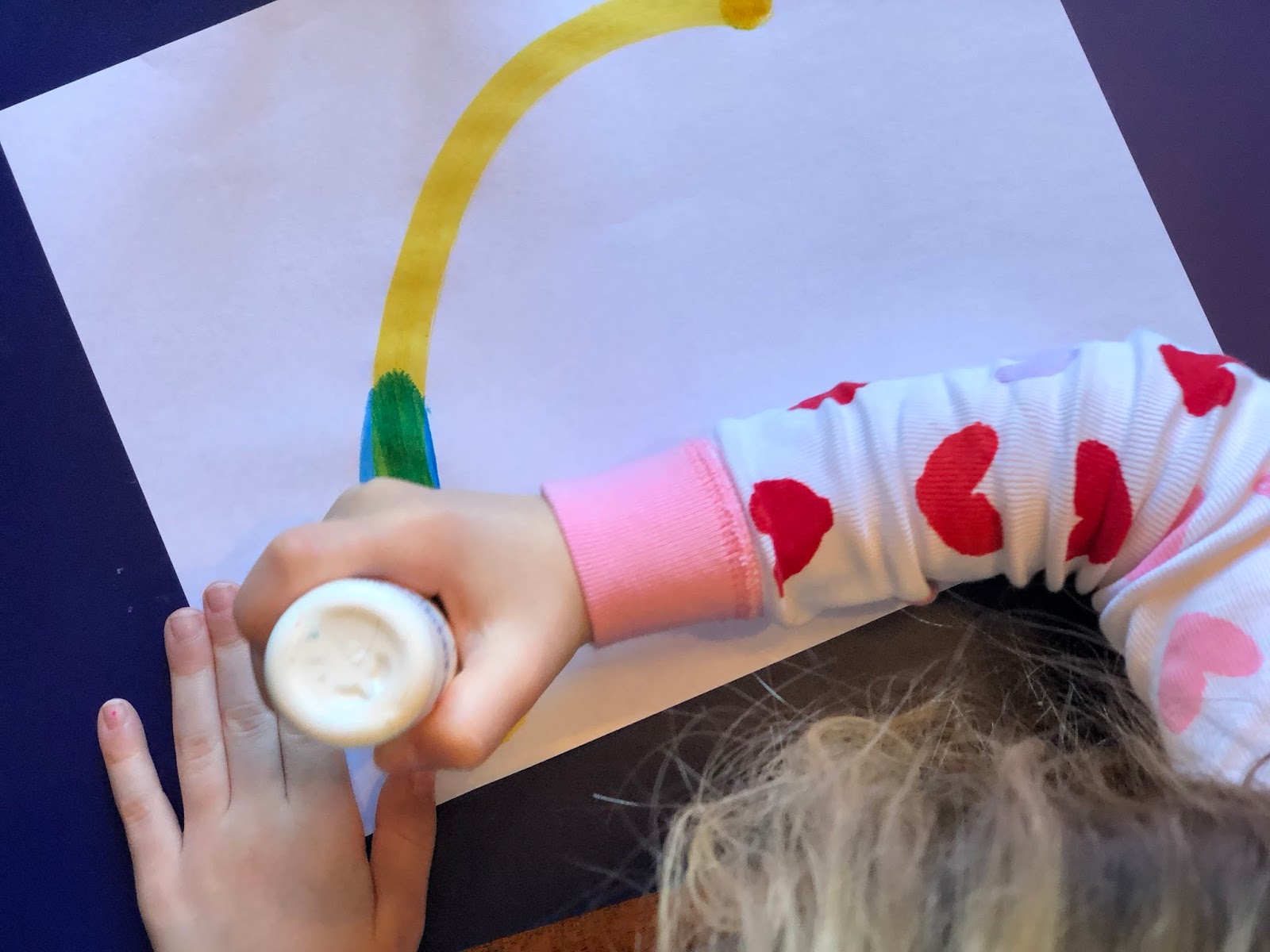 Miss 4 mixed the primary colors yellow and blue (she could see that they yellow water was going to “walk” to the blue water) with her dot markers. To her delight, she discovered that the result was green! She excitedly placed the piece of green construction paper next to the empty cup between blue and yellow.